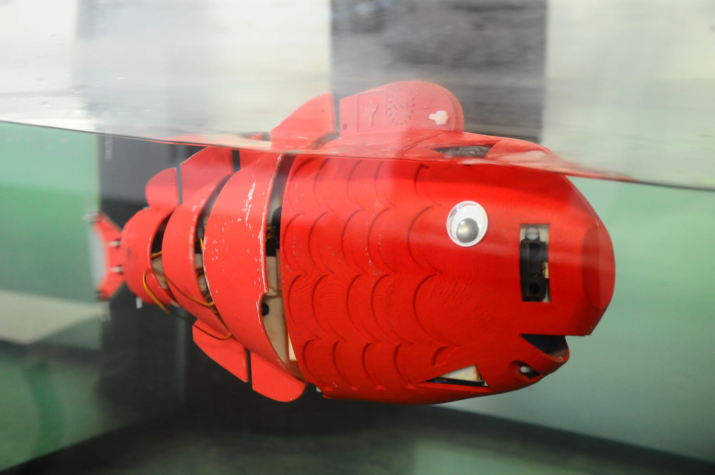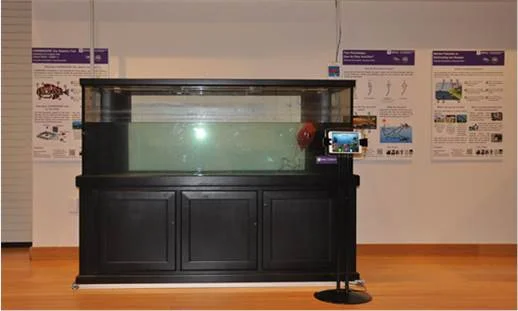 The exhibit features a robotic fish is remotely operated by an iDevice application. The exhibit includes educational posters on the topic robotics, fish physiology, and marine pollution. The robotic fish is propelled by a three degree-of-freedom multi-linked tail actuated by servomotors. The exhibit affords visitors the control of the robotic fish with an iDevice application. After a brief tutorial, visitors can utilize one of three different control modes in the application, which enable a user to directly maneuver the robotic fish, create a trajectory to guide the robotic fish through real-time visual feedback, or allow its onboard infrared sensors to autonomously guide the robotic fish. These modes are named manual, semi-autonomous, and autonomous mode, respectively. Visitors are free to switch between control modes of their choosing throughout the interaction.